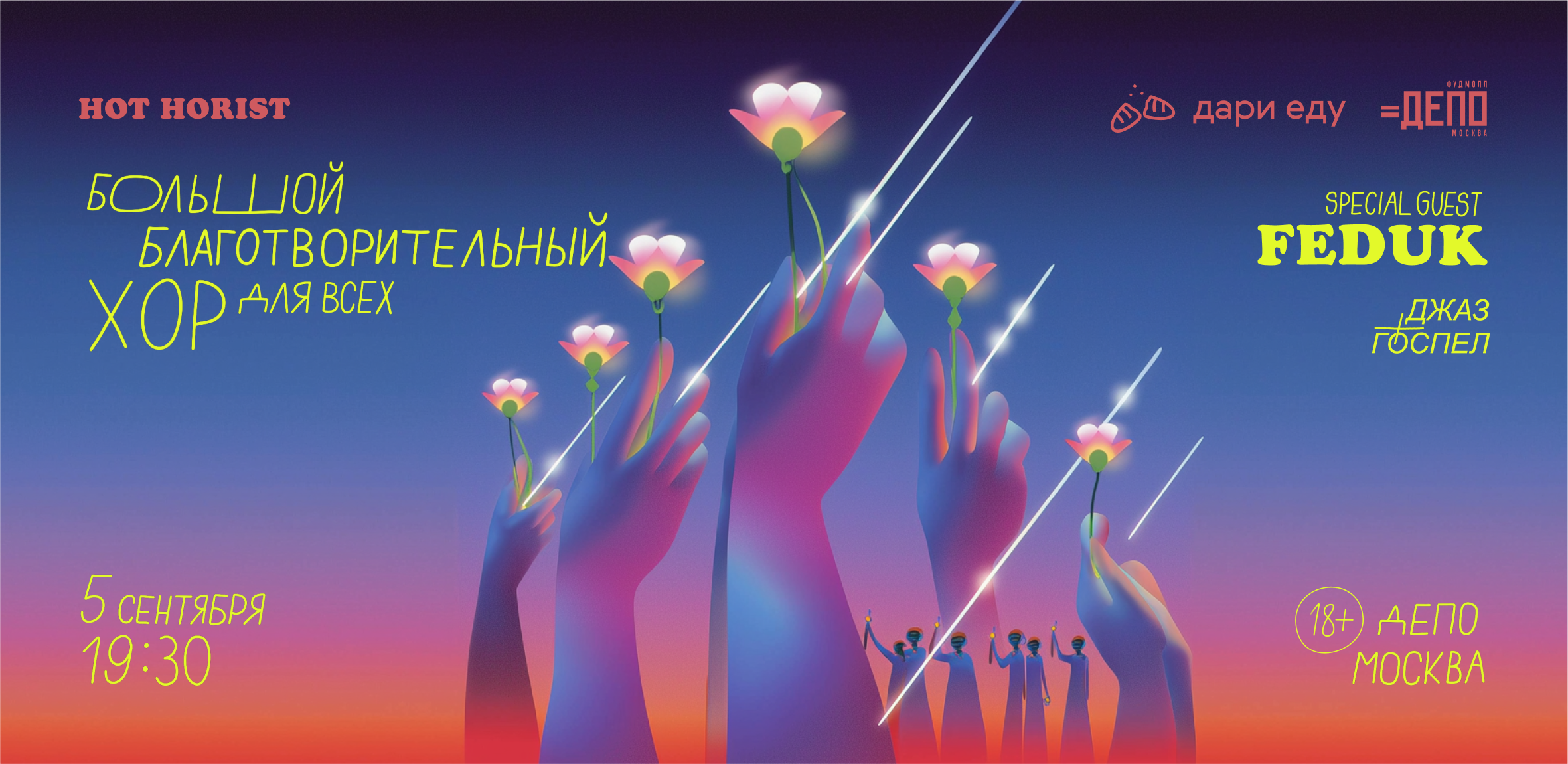 В честь Международного дня благотворительности участники мероприятия объединятся в большой хор и исполнят мощный мэшап, который сочетает в себе классические мотивы госпела и джаза с хитами популярного исполнителя FEDUK. А в конце программы у вас будет возможность спеть вместе с самим артистом. Никаких специальных вокальных навыков не требуется – процесс будет лёгким и увлекательным. Главное – ваше желание сделать мир чуточку лучше. Этот день – идеальный шанс насладиться живым исполнением любимых треков, ощутить радость жизни и внести свой вклад в благое дело. Все собранные средства пойдут на благотворительный проект «Дари еду!», который с 2016 года оказывает помощь тем, кто оказался в трудной жизненной ситуации. Выбирайте удобную обувь, чтобы было комфортно петь и танцевать в течение полутора часов, и не забудьте взять с собой паспорт – мероприятие предназначено только для лиц старше 18 лет. Приобретайте билеты заранее (https://hothorist.com/classes) . Билет обеспечивает доступ на мероприятие и выдачу материала для совместного исполнения. Ждём вас на самом тёплом событии осени, где музыка и доброта соединятся в одном общем хоре.